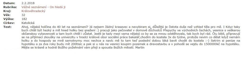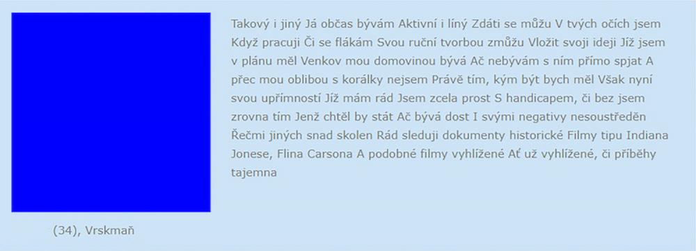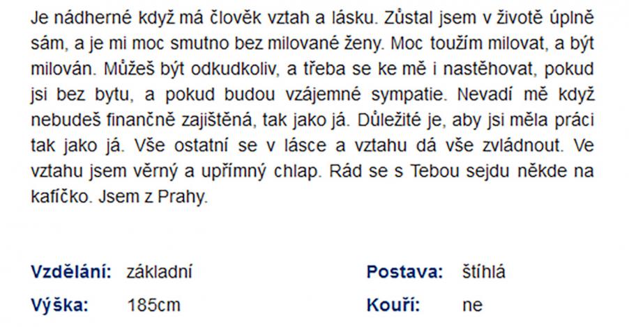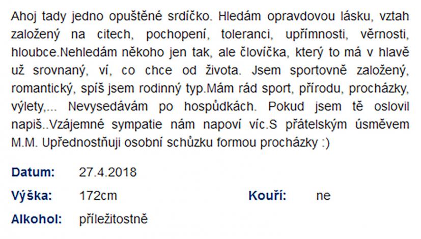 Jsem zadaný tak napůl, ale asi už chci někoho opravdového, na celý život. Takové lidi na seznamce nenajdete. Je to zoufalost a zoufalosti dělají zoufalci. Přece nechcete být s někým zoufalým... jen kdyby chtěl zoufat společně, to je jiná.