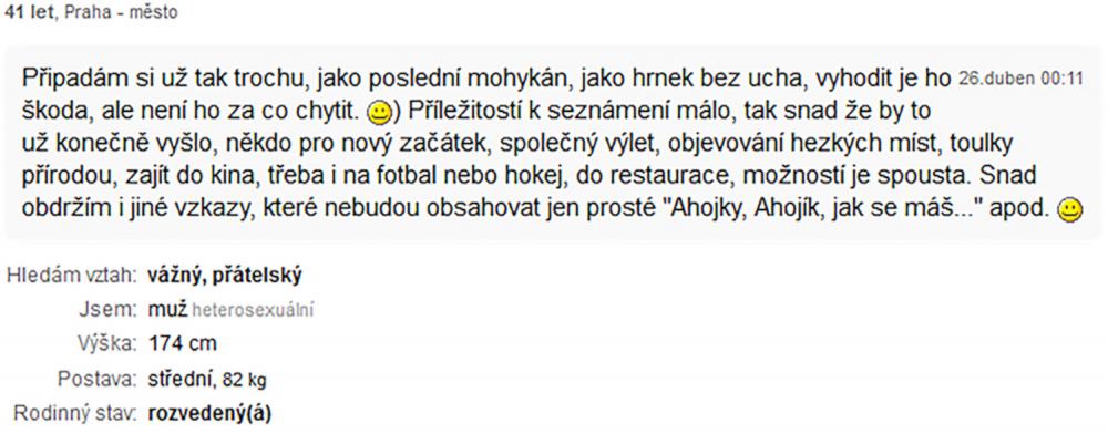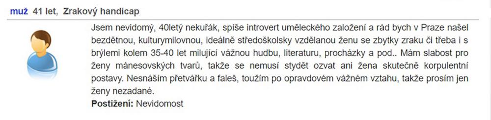 rád bych se nejdřív představil, jsem muž, 42 let (v květnu), VŠ, žiji sám v Brně. Teď jsem akorát na Tinderu ... Osamělost ... to je to správné slovo, člověk nikdy není v dnešním světě sám a přitom vlastně jen on sám může změnit svůj život. Mám diagnózu, mimo jiné parciální sociální fobii ... no jsem prostě nesmělý, ale léčím se. Třeba navštěvuji kurzy divadelní improvizace.