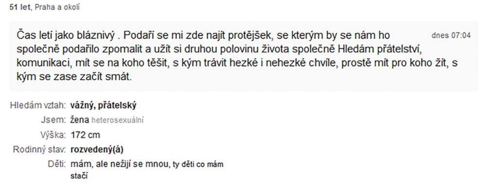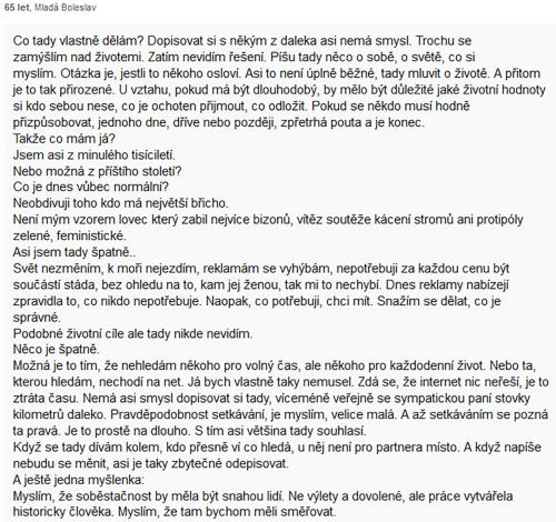 charitativních projektech - a to až dosud, resp.stále ještě), mne motivuje zejména přesvědčení o tom, že aktivní život ve dvou může pokračovat i v mém věku, ale musí pro to člověk něco dělat. Letos mne soud rozvedl s mým celoživotním partnerem, klasické seznamky nezatracuji, ani ty výběrové, ale přijdu si v nich jako v e-shopu, kde se nedostává toho co hledám s nedostatkem zboží, které hledám, případně to tam nedokážu najít.