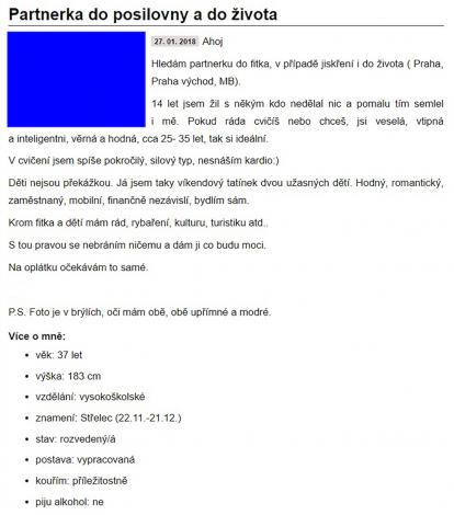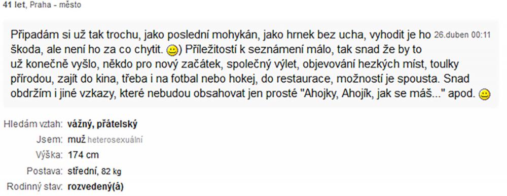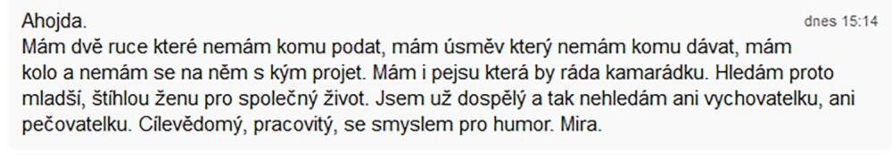 rád bych se nejdřív představil, jsem muž, 42 let (v květnu), VŠ, žiji sám v Brně. Teď jsem akorát na Tinderu ... Osamělost ... to je to správné slovo, člověk nikdy není v dnešním světě sám a přitom vlastně jen on sám může změnit svůj život. Mám diagnózu, mimo jiné parciální sociální fobii ... no jsem prostě nesmělý, ale léčím se. Třeba navštěvuji kurzy divadelní improvizace.