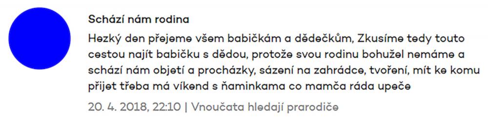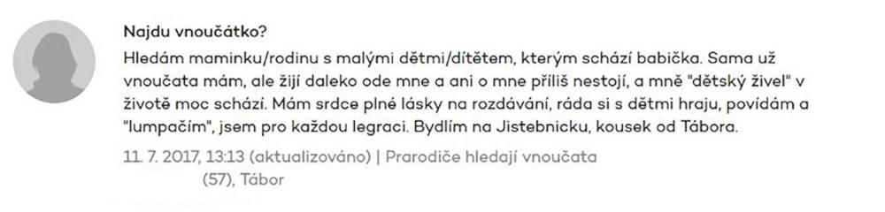 Přítomnost blízké osoby umocňuje nejen pocity štěstí v radostných chvílích, ale i naopak poskytuje úlevu při zármutku, bolesti a zklamání. Protože vím, jak je náročné najít s truchlícími oporu, kterou zoufale postrádají, cením si projektů a nápadů, jako je ten od Kateřiny Šedé. Neschopnost nebo spíše nemožnost nalezení blízké osoby v takto náročných životních situacích zažívám při své práci často a vím, že to není ničí chyba, jen je někdy nutné mít prostředníka, který vám pomůže udělat ten pomyslný první krok, oslovit někoho nebo se s vámi zamyslet, koho vůbec oslovit můžete. A to se zdaleka netýká jen starších lidí. Ano, samozřejmě, že čím je člověk starší, kruh jeho blízkých se neustále zmenšuje, to je přirozený běh života. Ale ono to postrádání blízkosti a osamělost ani tak není kvůli tomu, že fyzicky není opravdu nikdo, kdo by mohl fungovat, s kým by si člověk nemohl být blízký. Jde o to, že lidé (ať už staří nebo mladí) jsou zdrženliví v začátcích, pokud jim do života přijde náhlá ztráta, nevědí, na koho se obrátit, protože s těmi nejtěžšími břemeny se často obraceli na ty, kteří právě odešli. Jednoduše se nechtějí vnucovat, nechtějí být nikomu přítěží a neví, zda někdo jiný chce být zcela jistě na blízku jim. Jistě, dalo by se říct, že zde se jedná o mimořádné události, ale je to docela stejný vzorec jako u zbytku populace.