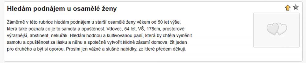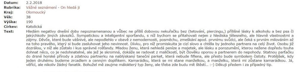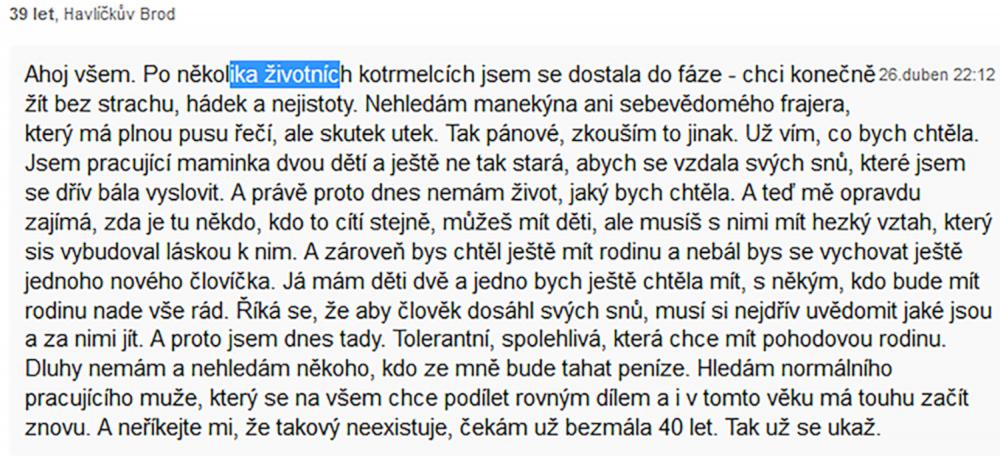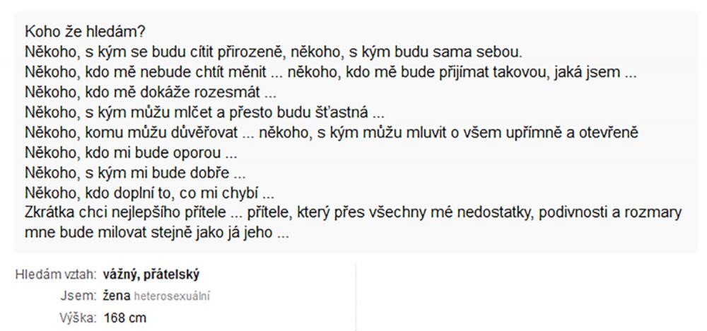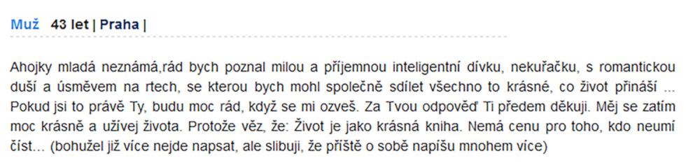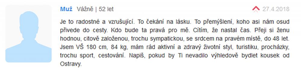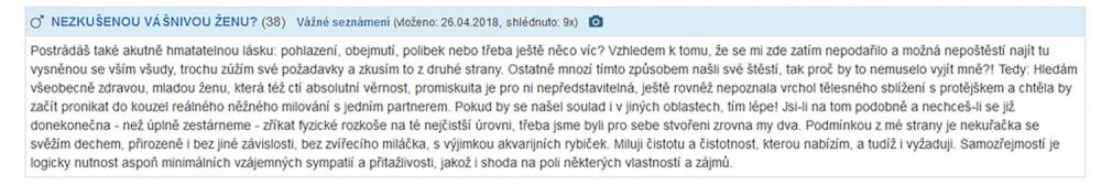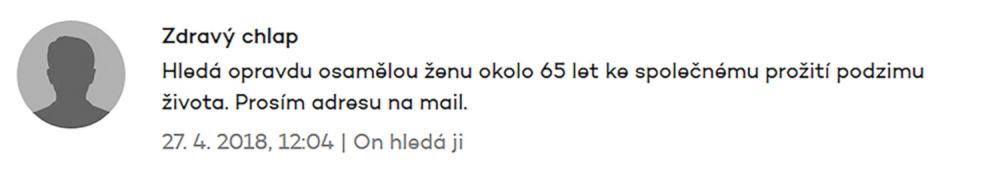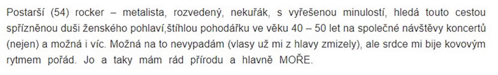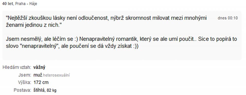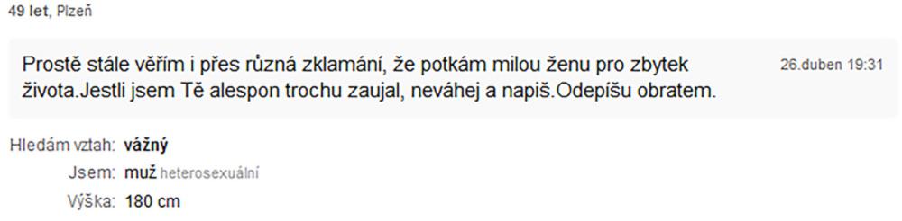 Jsem zadaný tak napůl, ale asi už chci někoho opravdového, na celý život. Takové lidi na seznamce nenajdete. Je to zoufalost a zoufalosti dělají zoufalci. Přece nechcete být s někým zoufalým... jen kdyby chtěl zoufat společně, to je jiná.