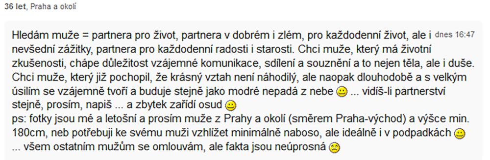 A pak nastává ta záludná otázka, kde se mají dva lidé potkat? Samozřejmě, i na nás ženách padá určitá míra zodpovědnosti, a místo, abych nyní vyhlížela v autobuse nový objev a následně ho oslovila, píšu na mobilu tento inzerát. Z druhé strany, i přes větší rovnoprávnost žen a samostatnost v životě, přiznejme si, první krok stejně musí jít od chlapce. To je prostě základ přírody.