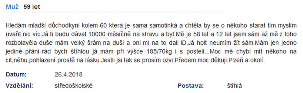 K: Víte, mně už je po čtyřicítce, já se nemůžu na internetu seznamovat s mladýma holkama. Musím brát jen ty starší, už jetý, co mají děti. Na první schůzce jsem maximální slušňák. Nic si nedovolím. Vykládám, jak mám děti rád, vyptám se, jak se její děcka jmenují. Musím si to ale nenápadně napsat. Ono se to plete, dneska je to samej Jakub a Barborka. Domluvím si druhou schůzku a na tu přijdu s prkýnkem. A vony to žerou aji s navijákem.